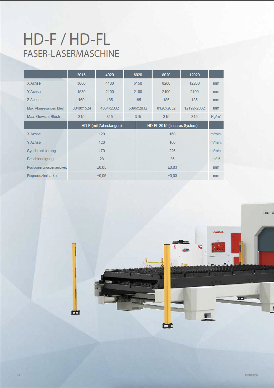 Durma HD-FL Laserschneidemaschine sind schnelle Schneidemaschinen. Die HD-FL Laserschneidmaschine zeichnet sich durch ihre Fähigkeit aus, schnelle Schnitte durchzuführen. Darüber hinaus sind Qualität, Leistung und Wirksamkeit garantiert. Achsbewegungen werden mit modernsten Linearmotoren ausgeführt, die sehr hohe Beschleunigungs- und Bewegungsgeschwindigkeitswerte erreichen können.  Mit Linearmotoren werden eine sehr hohe Beschleunigung (max. 35 m/s2), eine agile Bewegungsgeschwindigkeit (synchron 280 m/min) und eine Weltklasse-Positionierungstoleranz (±0,03 mm) erreicht.